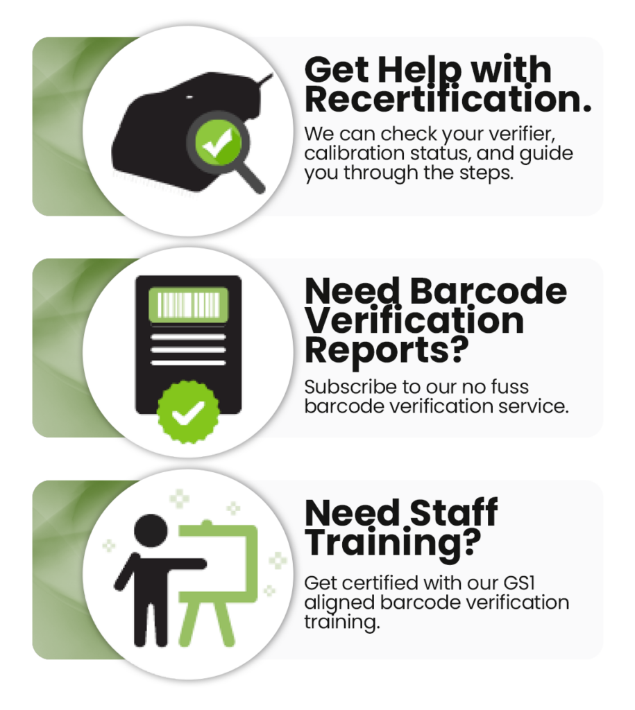 Barcode Verifier Recertification ensures your verifier is accurately calibrated and compliant with international barcode verification standards (ISO/IEC 15416 and 15426).